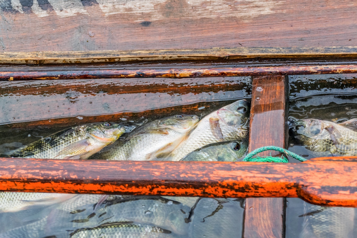 La pêche à la nasse est utilisée pour attraper ces petits poissons et des crevettes. Les nasses sont déposées au fond de l’eau et récupérées plus tard. Pour les retrouver, elles sont attachées à un fin bambou qui dépasse hors de l’eau.