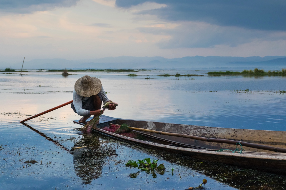 Sur le lac Inle, les Inthas vivent vraiment en harmonie avec la nature. Les jardins flottants attirent les poissons en tout genre et des nasses sont également disposées dans les jardins flottants !