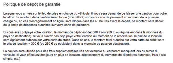 La question : combien de voyageurs vont consulter les mentions générales de vente, pour se rendre à la section dépôt de garantie pour lire un gros pavé pour voir enfin que ce pavé ne s’applique qu’à quelques pays, qu’il faut ensuite aller sur une autre page, sur laquelle il faut choisir le pays pour arriver sur la page du pays et avoir les informations recherchées.