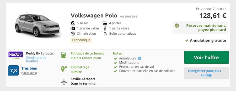 En d’autres mots, pour un même véhicule, récupéré dans la même agence et aux mêmes dates, le tarif sera plus bas avec RentalCars qu’en direct auprès du loueur. Un bon plan testé et approuvé et à conserver pour vos prochains voyages. Je le répète, ce n’est pas dédié à l’Andalousie ! Vérifiez les prix directement sur leur site ici et vous verrez l’écart est non négligeable …
